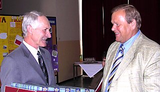 ![]() Bezirkshauptmann Hofrat Mag. Josef Kronister und Bezirksschulinspektor Alfred Grünstäudl danken dem scheidenden Direktor |